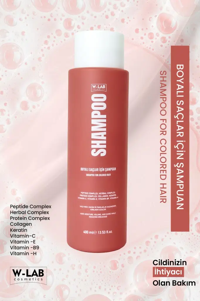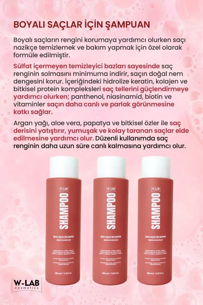 W-LAB BOYALI SAÇLAR İÇİN ŞAMPUAN 400ML,boyalı saçların rengini korumaya yardımcı olurken saçı nazikçe temizlemek ve bakım yapmak için özel olarak formüle edilmiştir. Sülfat içermeyen temizleyici bazları sayesinde saç renginin solmasını minimuma indirir, saçın doğal nem dengesini korur.