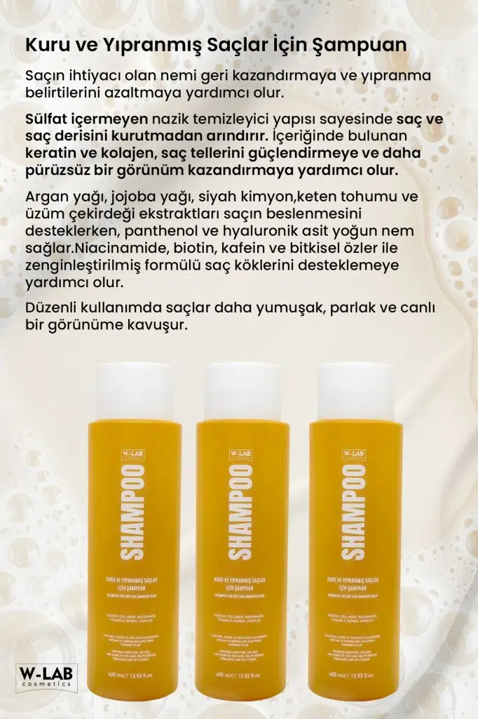 W-LAB Kuru ve Yıpranmış Saçlar İçin Şampuan 400 ml, saçın ihtiyacı olan nemi geri kazandırmaya ve yıpranma belirtilerini azaltmaya yardımcı olur. Sülfat içermeyen nazik temizleyici yapısı sayesinde saç ve saç derisini kurutmadan arındırır.